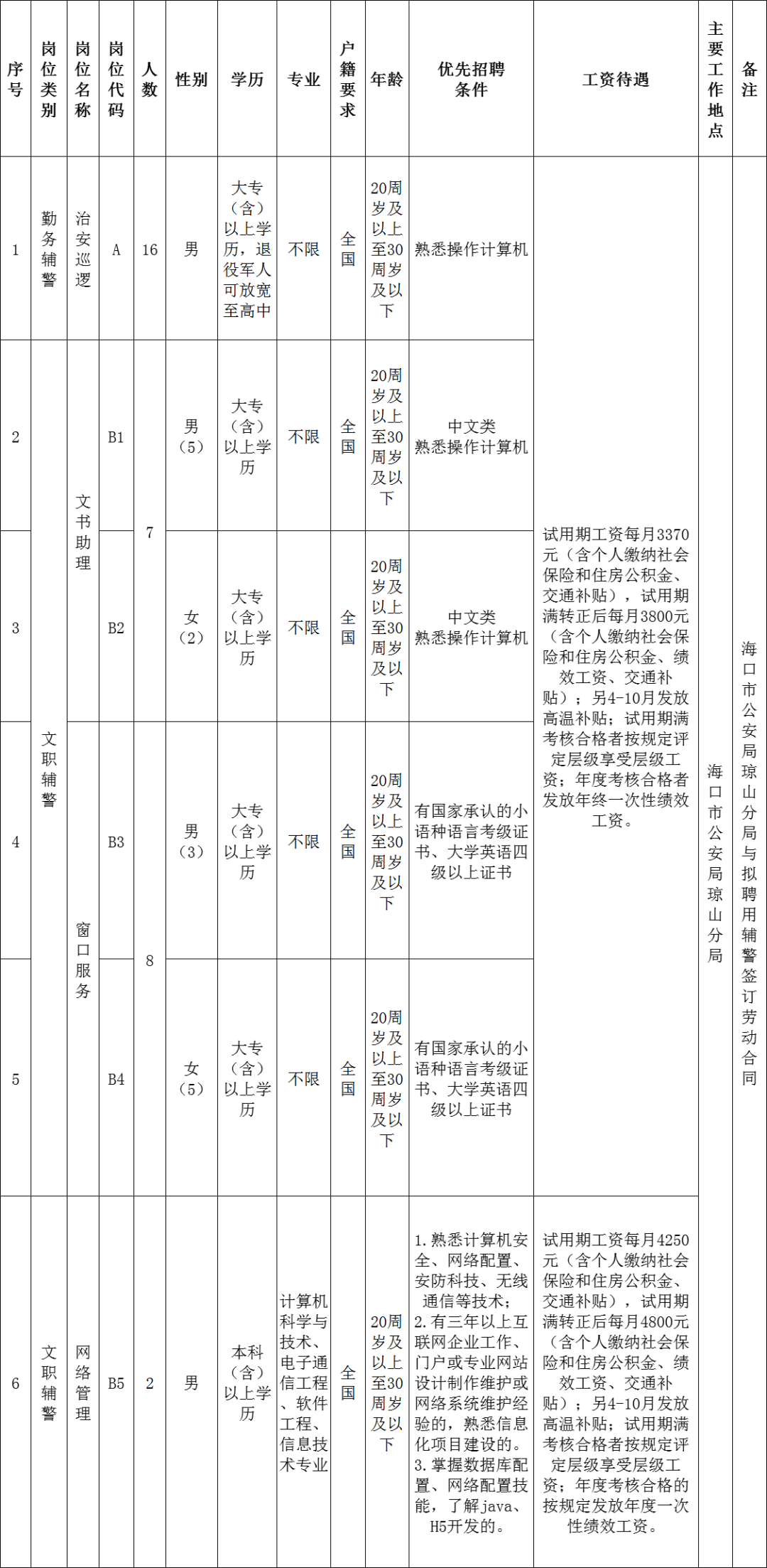 根据工作需要,海口市公安局琼山分局现面向社会公开招聘警务辅助人员(以下统称辅警),具体情况如下: